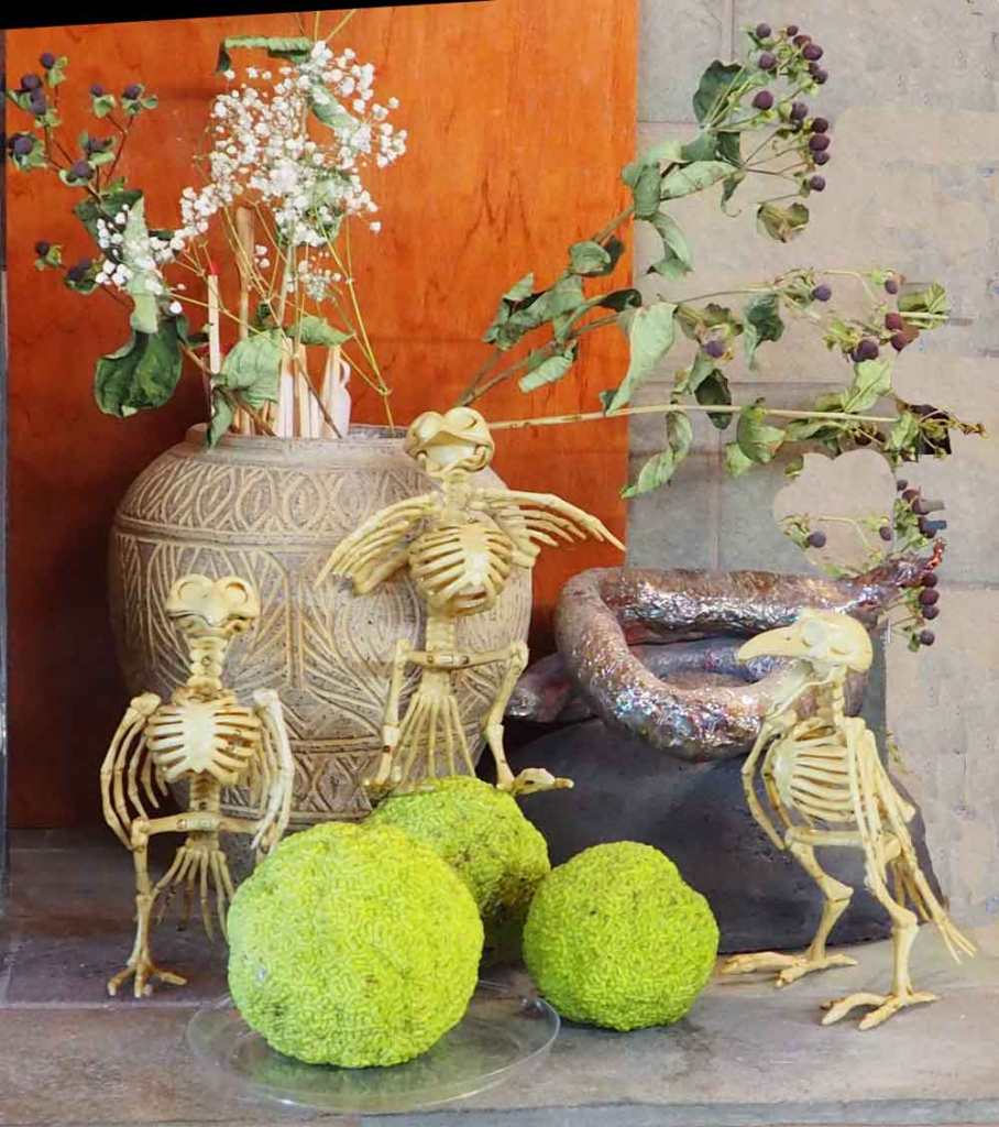 Creepy improvised still life. Plastic bird skeletons from the Dollar Store. Do we need a pumpkin?